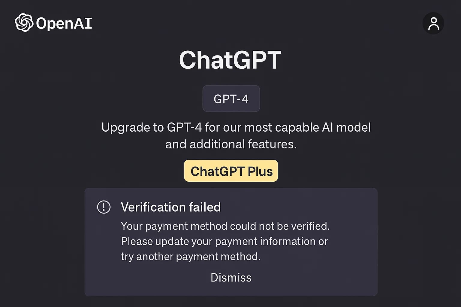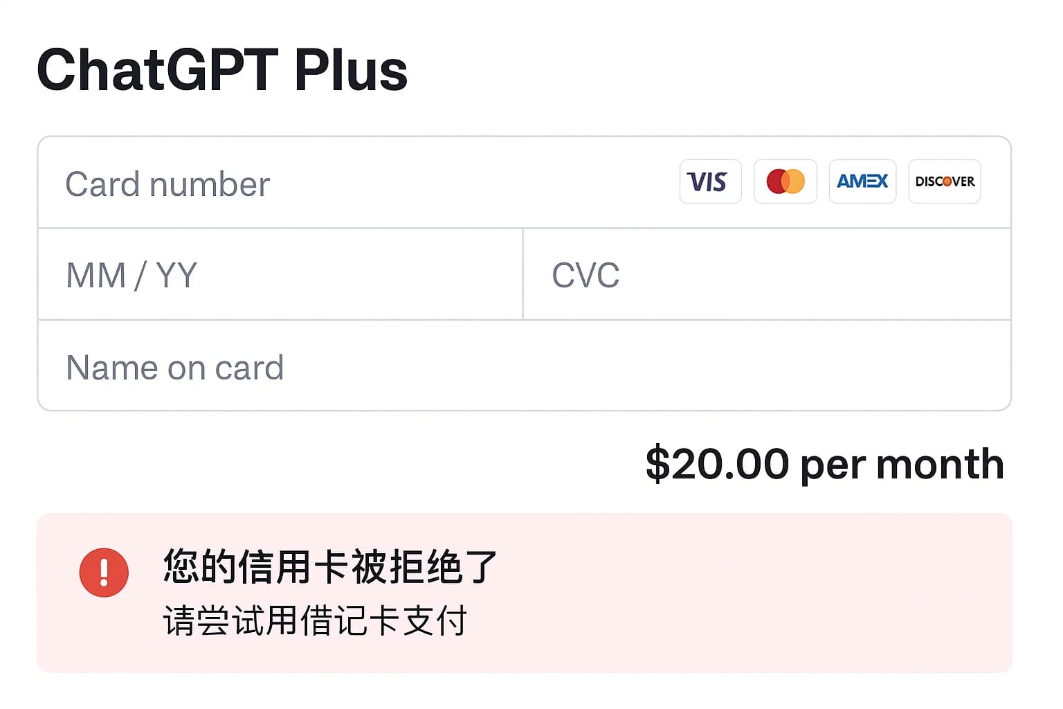 很多用户在订阅或续订 ChatGPT Plus 时会遭遇支付过程中的种种错误提示。其中最常见的情况是使用信用卡或借记卡付款时被拒绝。例如,系统可能提示: